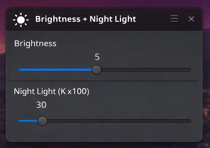 The core capabilities already exist thanks to projects like Redshift and the broader Linux ecosystem. What I built is just a thin layer on top — a lightweight interface that brings brightness and color temperature into one small, focused utility.